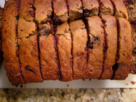 Really the only change from the original recipe is substituting applesauce for shortening or oil. And this time I added a cup of 60% Ghirardelli chocolate chips because I just can't resist them. Okay, I confess - I add chocolate chips pretty much every time I bake banana bread. I'm bringing this loaf to our moms' group this morning as a not-quite-breakfast snack. What baked goods do you try to pass off as breakfast?